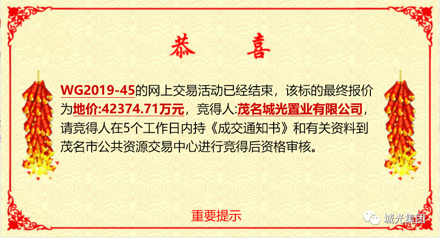 捷报!城光集团再次拍地成功! 一个月内拿下茂名三宗地块! 发表日期:2019-12-31 浏览次数:0